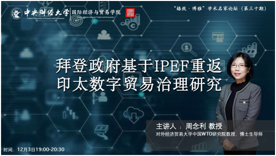 2022年12月4日,对外经济贸易大学中国WTO研究院教授,博士生导师和经理助理周念利做客“格致·博雅”学术名家论坛第三十期,做了题为《拜登政府基于IPEF重返印太数字贸易治理研究》的精彩讲座。本次讲座通过腾讯会议在线进行,校内外师生近百人参与了本次讲座。讲座由永利yl23411副经理王立勇教授主持,并由张艳副教授进行点评。