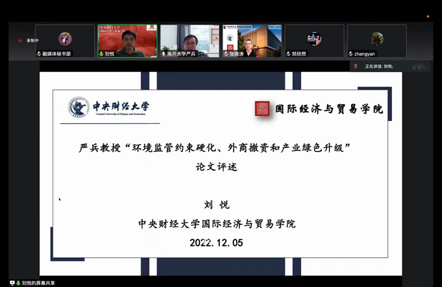 在讨论环节,霍达教授、张艳副教授等师生就撤资企业异地投资、服务业外资企业、ESG报告披露等问题与严兵教授进行了深入讨论。刘悦副教授对论文进行点评,指出了论文在选题、数据和结论方面的亮点,并对论文的分析方法和进一步拓展提出了相关建议。