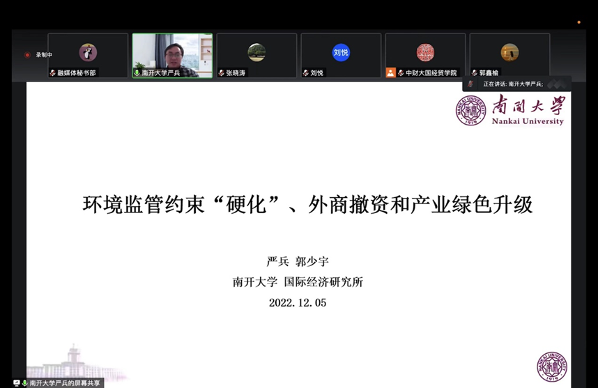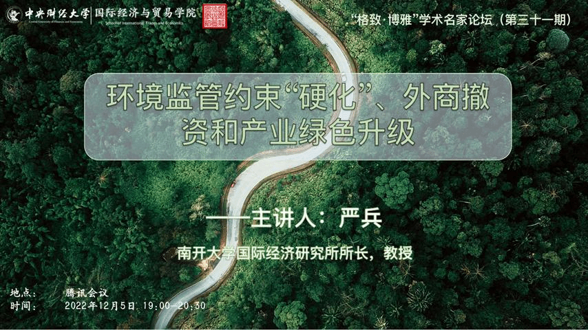 2022年12月5日,永利yl23411举办了第三十二期“格致·博雅”学术名家论坛,南开大学国际经济研究所所长严兵教授做了题为《环境监管约束“硬化”、外商撤资和产业绿色升级》的精彩讲座。本次讲座通过腾讯会议在线进行,众多校内外师生参与了本次讲座。讲座由永利yl23411经理张晓涛教授主持,刘悦副教授进行点评。