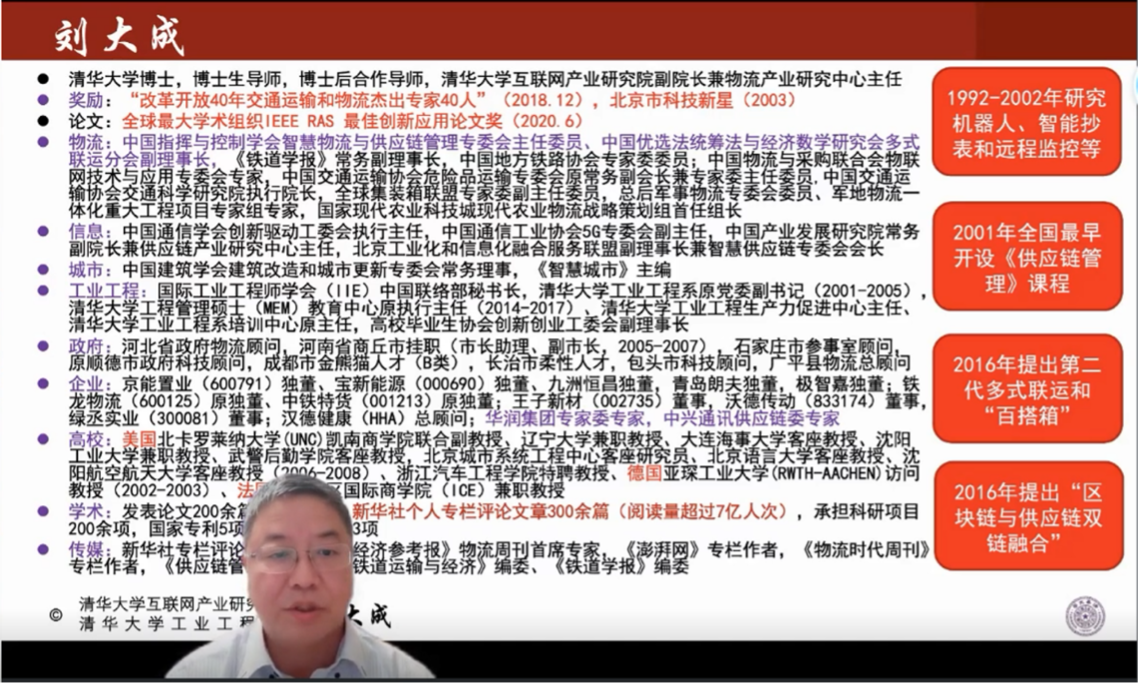 刘大成教授的讲座从50年前的信息化、25年前的网络化到10年前的数字化这条线索展开,认为从规模经济效应、网络经济效应再到范围经济效应的发展视角来看,(产业)智慧供应链的全面应用还仅仅是开始。首先,刘大成教授以波音777的虚拟制造事件为例介绍了信息化的高度成就,表示软件数据平台的普及和应用可以节约大量时间,可以代替并且超越手工的能力。其次,刘大成教授以利丰集团供应链管理为例讲解了网络化的影响。在利丰集团的供应链管理被并购案例中,作为在信息化强大时迅速崛起的企业,在信息化到网络化过渡的过程中供应商与用户直接对接导致整个经营的衰退,使我们看到了信息化到网络化过程中的明显变化。第三是刘大成教授阐释了数字化底层构架,数字化涉及到的赛博物理系统的核心在于感知、决策、执行,使工件自带信息,优化后的信息平台,不仅直接将指令发送给工人,而且还要发送给机床、机器人,AMR等更多系统,这样一来底层可以实现自洽,相互之间可以通信。刘大成教授通过滴滴打车的运行模式,详细地分析了上述过程。