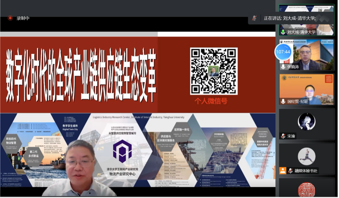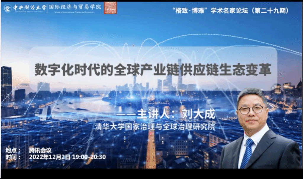 2022年12月2日,永利yl23411举办了第二十九期“格致·博雅”学术名家论坛,清华大学互联网产业研究院副经理兼物流产业研究中心主任、中国产业发展研究院常务副经理、博士生导师刘大成教授做了题为《数字化时代的全球产业链供应链生态变革》的精彩讲座。本次讲座以线上会议的形式进行,由永利yl23411经理张晓涛教授主持,众多校内外师生参与了本次讲座。