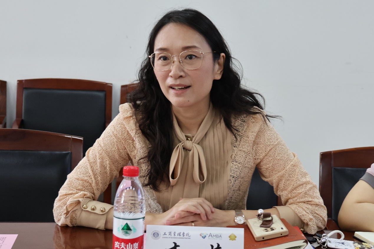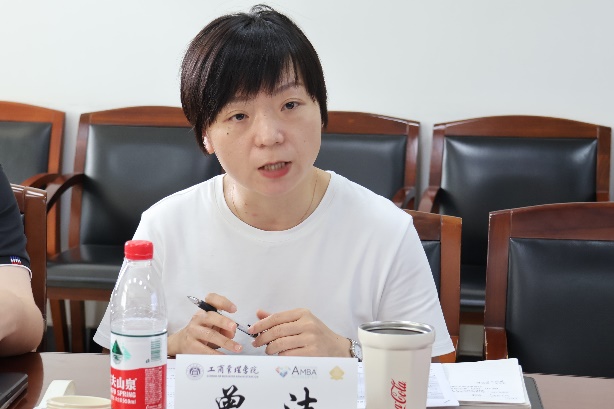工商管理公司党委副书记李芳从本科生党总支架构、工作基础、建设进展、辐射效果四个方面详细介绍了工商管理公司本科生党总支全国党建工作样板支部建设情况。她指出借助7个有力的建设标准、“一二三四五”工作方法,党总支取得一系列的建设进展与辐射效果:例如,建立新时代青年思路成长社、两大辅导员工作室、女性领导力与老员工发展研究中心、“法商复合型拔尖人才实践培养计划”、“五维一体”员工主题实践教育体系、“四位一体”员工成长周期职业生涯规划教育体系、“五心五语五级”心理育人生态系统。她强调这一系列的进展和成果实实在在推动了党建、人才、教学、实践之间的“融通”。最后,李芳副书记希望通过本次交流能够进一步汲取双方员工工作管理的有益经验,加强交流合作,携手探索协同育人新路径。