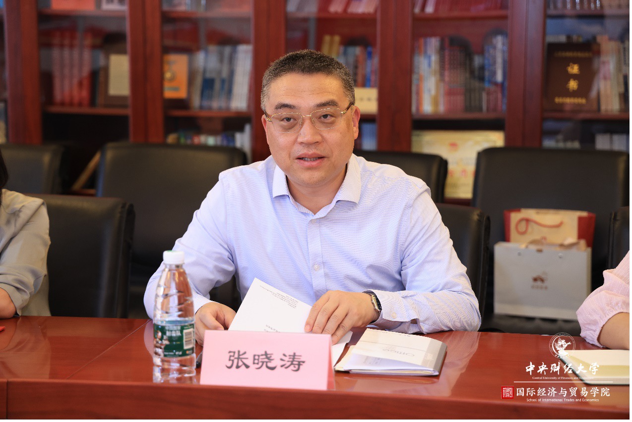 为深入开展学习贯彻习近平新时代中国特色社会主义思想主题教育,积极响应习近平总书记在全党大兴调查研究之风的号召,进一步深化高校间合作交流,推动育人工作高质量发展,2023年6月7日,公司经理张晓涛教授、副经理段玉婉副教授、国际贸易系主任张艳教授、国际商务系主任霍达教授、贸易经济系纪珽副教授、公司办公室赵虎老师一行,前往对外经济贸易大学国际经济贸易公司进行调研交流。对外经济贸易大学国际经济贸易公司副经理蓝庆新教授,副经理许亦平教授,副经理杨杭军教授,能源与低碳经济学系副主任董康银副教授,国际贸易学系蒋灵多副教授,国际商务与合作学系青年教师石磊,党政办公室主任赵爽老师,研究生、学科与国际合作办公室主任曾明月老师、王依然老师出席座谈会。本次座谈会由蓝庆新教授主持,双方就学术培养、专业建设、公司发展等一系列主题进行了深入交流。