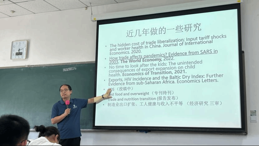 该专题由中国农业大学经济管理公司林发勤教授讲授。林教授通过相关数据展示了当前推动可持续健康膳食模式的重要意义,加入WTO之后关税的大幅度调整对我国膳食结构变化的影响与机制值得深入研究。林教授给同学们分享了自己的研究成果和经验,主要包括贸易与公共健康、因公受伤以及膳食健康三个方面的内容,为同学们提供了多元化的研究角度,拓宽了员工的视野。关于贸易与公共健康,林教授详细介绍了论文“How trade affects pandemics? Evidence from SARS in 2003”,向同学们提供了一种解决贸易与健康研究中的反向因果问题的方法,并介绍了构造地区或企业进出口关税指数的方法。关于贸易与因公受伤,林教授介绍了论文“The hidden cost of trade liberalization: Input tariff shocks and worker health in China”,揭示了贸易自由化之后影响劳动工人健康的一种途径,即贸易自由化降低关税之后,工人劳动时间延长从而对劳工健康产生负面影响。关于贸易与膳食健康,主要聚焦于贸易与肥胖问题的关系,林教授的论文“Weight gains from multinational fast food restaurants: Household evidence from China”,利用中国家庭层面的数据进行了实证研究,发现KFC、麦当劳等快餐店造成受教育程度低的人群出现超重肥胖健康问题的概率显著增加。整个授课过程气氛活跃,师生积极讨论,让大家充分感受到林教授对于科研工作的热情,激发了同学们对国际贸易领域的学习和研究兴趣。