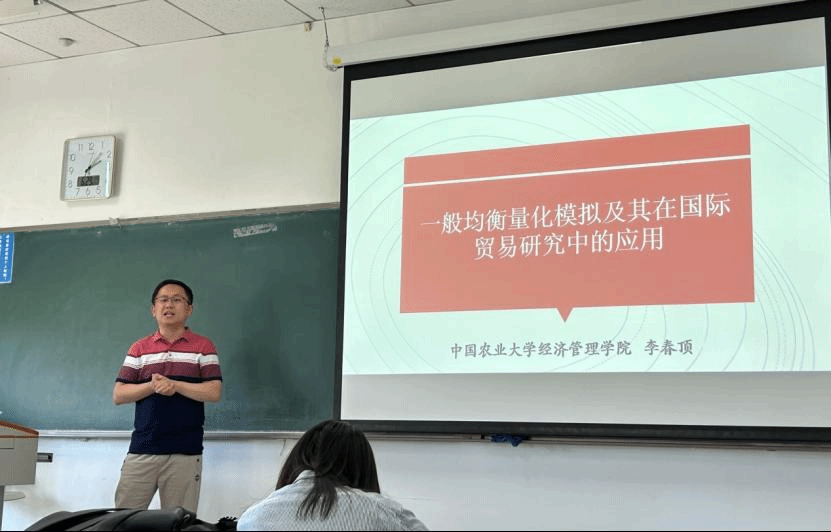 该专题由中国农业大学经济管理公司李春顶教授讲授。李教授介绍了AGE(或CGE)模型的概念、应用及其发展历程。AGE模型是以一般均衡理论为基础,通过联立方程组的方式刻画经济系统中各部门、各变量之间的相互作用,着重考察一个经济系统中各种商品和生产要素的供给和需求,如何通过价格来调节以达到均衡状态。目前AGE模型广泛应用于贸易、能源和环境、收入分配等研究领域。李教授着重介绍了AGE模型的构建过程,帮助同学们更好地理解模型构建的理论框架,并详细讲解了GAMS程序代码,现场演示了程序运行过程。从理论分析到程序运行的过程中,总会遇到新的问题,李教授建议同学们根据自己研究问题的具体需要,有针对性地进行模型学习,多在实践中总结经验,才能更好地掌握并应用模型。最后,李教授通过两个国际贸易问题研究案例,向同学们展示了AGE模型在实际研究中的应用,让同学们有了更深入的理解。案例一:RCEP的贸易效应及其多元分解——考虑全球价值链和“意大利面条碗”效应,论文构建了嵌入价值链和增加值贸易的全球一般均衡模型,使用2018年的实际数据将模型中的参数设置为变量,进一步校准和估计参数,建立数值一般均衡模型系统。案例二:后疫情时代的全球经贸秩序变迁与经济增长,论文分析了不同经贸秩序变迁情境下的经济增长效应,构建了嵌入价值链和增加值贸易的全球一般均衡模型,引入内生贸易不平衡结构、增加值贸易结构和价值链结构,以最新的2018年数据建立基准数据集,以校准和构建数值模型系统,将弹性取值假定为线性分布,增强了模拟结构的可靠性,这一研究成果对全球经贸秩序变迁的量化模拟分析具有重要的现实价值。李教授平易近人的风格、严谨的学术论证、渊博的知识储备,给同学们留下了深刻的印象。