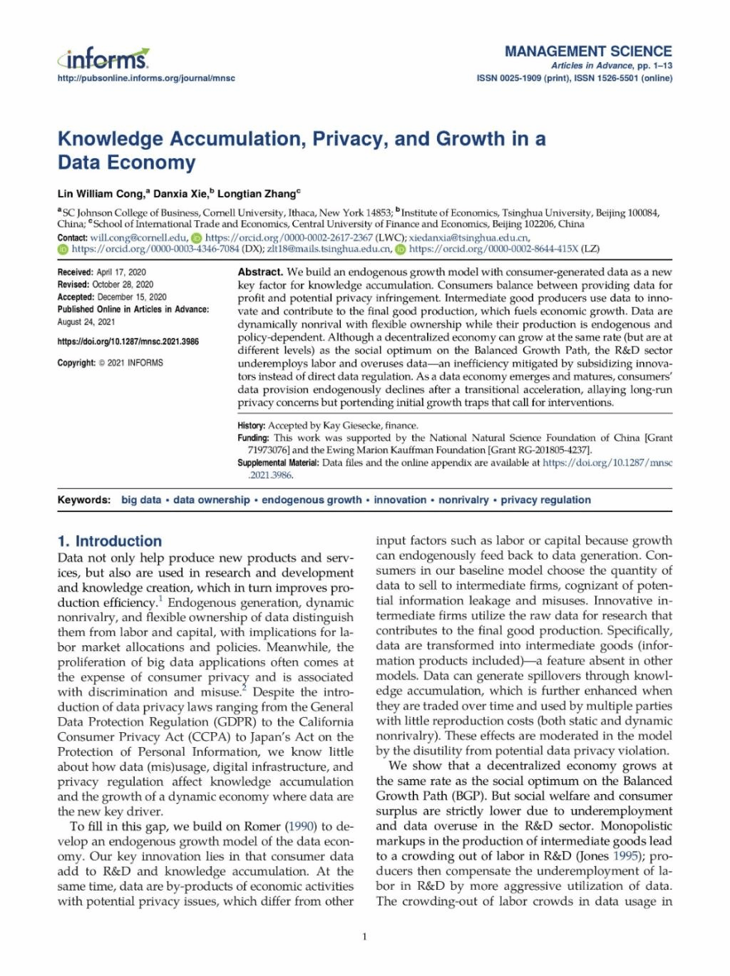 近日,公司张龙天博士与美国康奈尔大学Lin William Cong(丛林)副教授和清华大学谢丹夏副教授合作的研究成果“Knowledge Accumulation, Privacy, and Growth in a Data Economy”在SSCI、SCI期刊Management Science在线发表。该期刊由美国INFORMS学会主办,是管理科学/运筹学领域的顶级期刊。同时,该期刊属于中财大英文期刊目录AAA级。