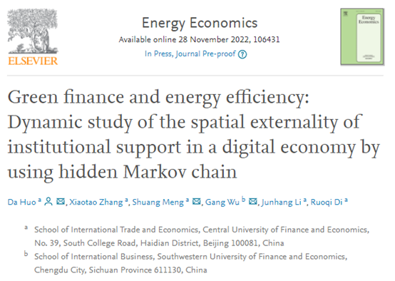 公司国际商务系霍达教授、张晓涛教授、蒙双副教授与西南财经大学吴钢副教授、公司国际商务硕士研究生李君航、国际商务本科专业生邸偌祺合作(同等贡献,共同第一作者)的研究成果“Green Finance and Energy Efficiency: Dynamic Study of the Spatial Externality of Institutional Support in a Digital Economy by Using Hidden Markov Chain”近日被能源经济学顶刊Energy Economics(中财外文AA)接受发表。