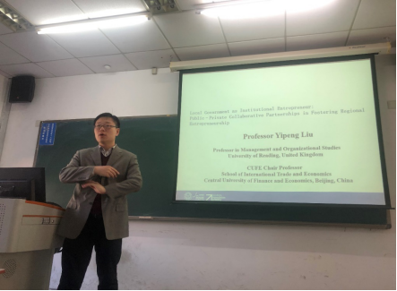 2019年3月14日上午,英国雷丁大学刘毅鹏教授应邀在沙河校区4号楼110教室为公司师生带来了题为“Local Government as Institutional Entrepreneur: Public-Private Collaborative Partnerships in Fostering Regional Entrepreneurship.”的学术讲座。