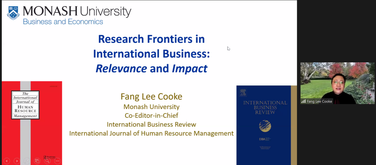 2021年12月10日北京时间19:00-20:30,永利yl23411通过ZOOM会议平台举办了“格致·博雅”国际学者论坛(第二期)暨国际商务团队工作坊(第六期)。本次论坛邀请到了莫纳什大学商公司副经理、澳大利亚社会科公司院士李应芳教授做了题为《国际商务研究前沿:相关性与影响》(Research frontiers in international business: Relevance and Impact)的精彩讲座,论坛由国际商务系主任霍达教授主持,校内外师生八十余人在线参会。