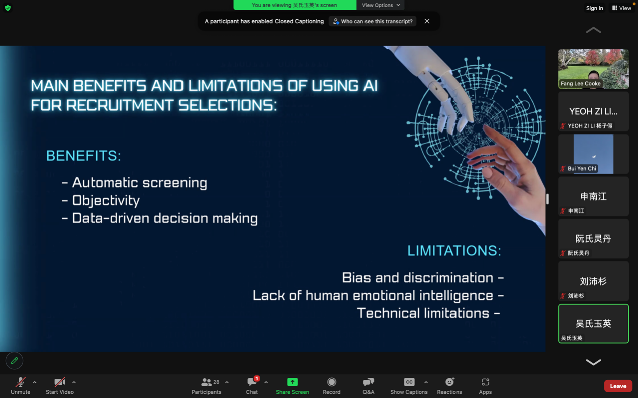 此次短期课程的独特之处在于,不仅仅是单方面地向同学们输出理论知识,同学们在课程中有幸参与四次小组作业,其中包括一次书面报告和三次课题展示。通过小组合作对人力资源管理各方面的课题进行研究分析。其中包括生活中员工对人力资源管理部门的不满研究、AI如何影响招聘过程和对工作需要的技能研究。这一过程既锻炼了学员们的团队协作和解决问题的能力,也为他们提供了在课堂展示的多重机会。
