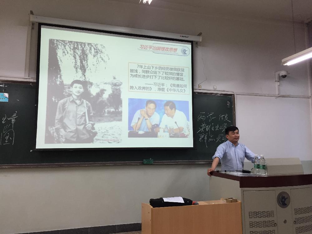 接下来,黄老师对习近平治国理政思想的主要内容进行了说明,从重点以下四个维度阐释了习近平治国理政思想精髓——“固本:坚持和发展中国特色社会主义”、“追梦:实现中华民族伟大复兴中国梦”、“实干:全面深化改革和建设法治中国”、“铸魂:培育和践行社会主义核心价值观”。黄老师在讲授过程中,将马克思主义理论与中国实际密切联系,将国外事例与中国发展加以对比,深入浅出,旁征博引。