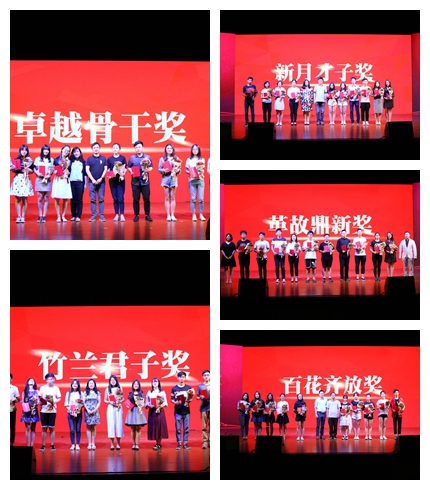 十佳歌手如此精彩的表演,让我们看到,四年间,同学们的身边已经涌现了这么多优秀的人才。晚会也进入第二轮颁奖仪式,共颁发新月才子奖、革故鼎新奖和百花齐放奖三类奖项。踏实刻苦,勤奋努力,求实创新,勇攀高峰,新月才子奖获奖者用自己的方式赢得了尊敬和奖励,凭不懈的奋斗树立起新的标杆;革故鼎新奖获奖者不甘平凡,在知识的高峰上勇于攀登,他们不甘寂寞,在竞赛的舞台上寻觅知音;极具国贸公司特色的百花齐放奖获奖者或热心公益,回报社会,或团结协作,共创佳绩。积小家之长,成大家之德,齐心协力,勇攀高峰,或积极参与,活跃校园,是他们让各类活动精彩纷呈,是他们为国贸的声誉添砖加瓦。他们,是国贸公司的骄傲!沈琪老师、刘悦老师、段玉婉老师、霍达老师、钱铁峰老师、林发勤老师为获奖者颁发了证书和鲜花。