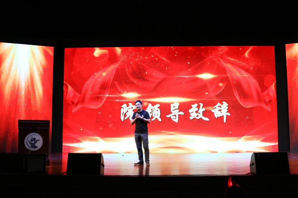 晚上七点,在全体人员入座后,晚会正式拉开序幕。屏幕上开始播放院团委员工会精心制作的开场视频。视频以时间为线索,回放了大学四年两校区毕业生们所经历的酸甜苦辣,传递出了不负初心、追求梦想的正能量。视频结束后,四位身着盛装的主持人走上舞台,他们分别是国贸13班、国商13班和中澳14级的辅导员王丹蕾老师,15级国际商务研究生班的卢昭明同学,中澳13级2班的周扬同学和中澳15级1班的蒋欣桐同学。国贸公司副经理符大海老师发表了开幕致辞,他先祝贺毕业生们顺利毕业,表达了自己的开心与感动,又引用胡适先生的名言“成功不必在我,而功力必不唐捐”寄语毕业生们,还与毕业生们分享了三条人生哲理:命运会眷顾执着梦想的人;踏踏实实地做自己的事情;在追求成功的路上做一个快乐的人。最后,他祝毕业生们不忘初心,追求梦想。符老师的嘱托深深印入每个人的心间。