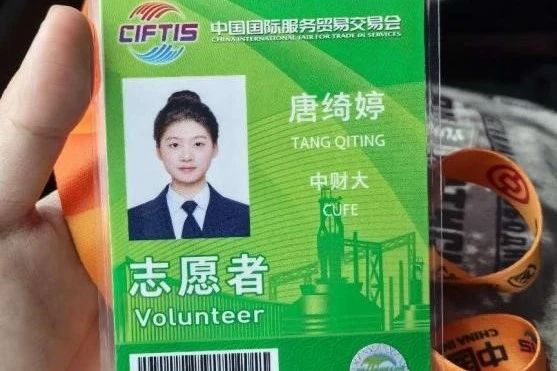 我是唐绮婷,来自21级国际经济与贸易班。我热心志愿服务活动,在校期间积极参与志愿活动,曾参与北京半程马拉松、PEPE欢乐跑、V蓝北京等多项志愿活动,至今累计校级志愿小时数超过180小时。我非常骄傲和自豪能够协助本次服贸会的顺利举行,并见证我国在服务贸易领域的高质量发展。