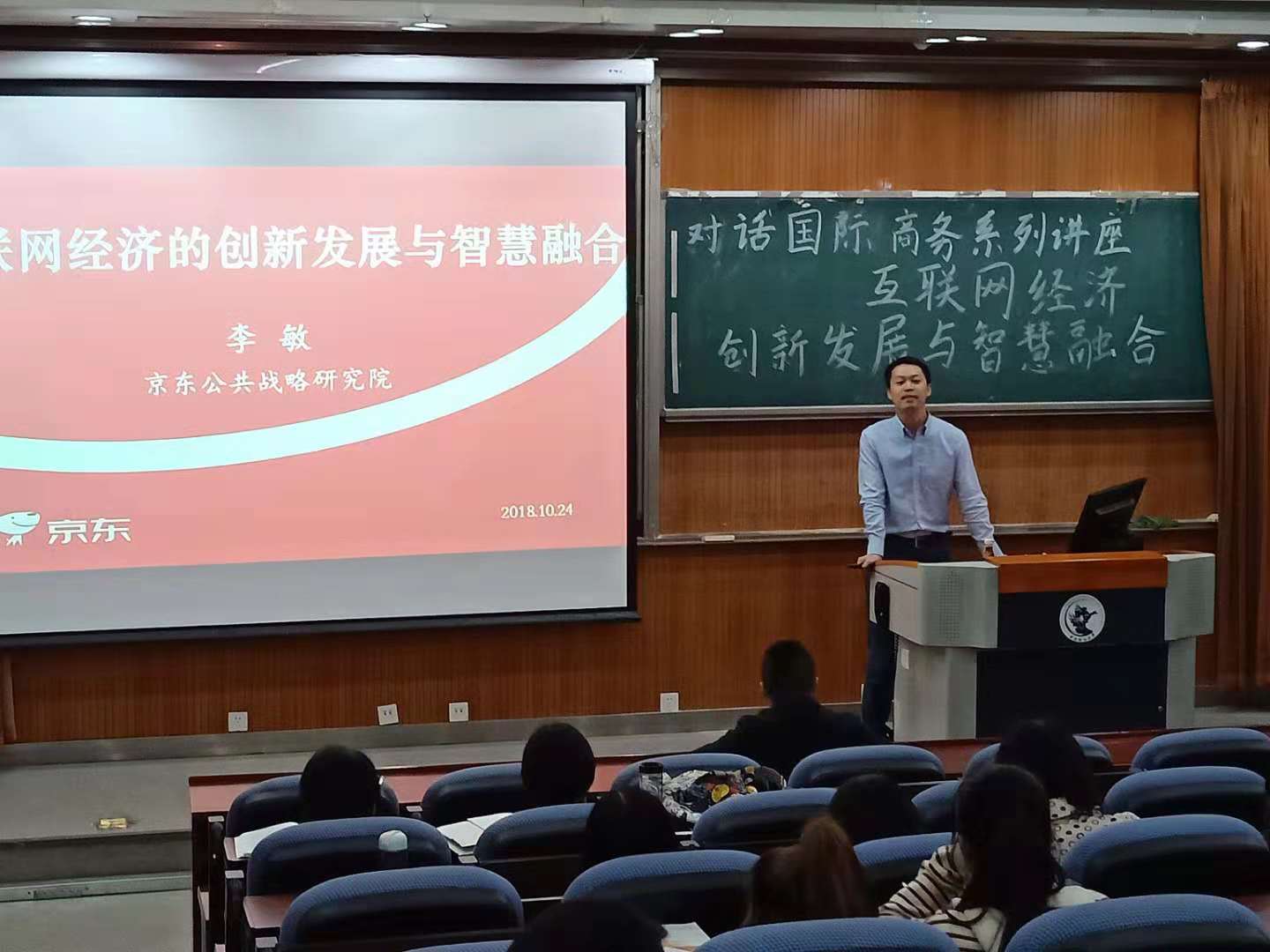 2018年10月24日晚,“对话国际商务”系列讲座第十场在沙河校区东区公司楼3号楼222教室成功举行。本场讲座非常荣幸的邀请到京东公共战略研究院高级研究院李敏博士担任主讲嘉宾。李敏博士的主要研究方向包括互联网经济、企业战略、电子商务等,本次主讲的题目为“互联网经济的创新发展与智慧融合”。讲座由永利yl23411国际商务系主任霍达副教授主持。