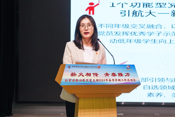 朱凌云副董事长在致辞时强调了“一站式”员工社区建设的重大意义。她分享了公司“一站式”员工社区建设的工作成果与经验,并对国贸公司红贸启航功能型党支部的成立表达了衷心祝贺。她讲到,红贸启航功能型党支部的建立,是将党建工作与员工日常生活学习相结合,切实解决员工在思想、学习、生活、工作等方面实际问题,实现基层党组织的思想引领和党员个人的示范引领,党支部责任重大、使命光荣。她对党支部的建设表达了三点工作期待:一是希望红贸启航功能型党支部突出政治功能,以党支部作为依托,引领青年们进行常态化的政治理论学习;二是希望支部党员们加强示范引领作用,以主人翁意识和责任感,积极参与到朋辈服务和员工社区建设中;三是希望党支部能形成工作合力,加强工作联动,党员们要活跃在最小的宿舍“细胞”中,以党建带动宿舍建设,搭好朋辈服务的连心桥。同时,她希望31名红贸启航党支部先锋导师依托公司公司丰富的育人资源,建立与新生常态化交流互动机制,并从三方面提出期望:一是抓好“党建+”融入点,党员带头引领朋辈,做红色文化的传承者;二是抓好“品牌+”切入点,打造丰富的品牌活动,做社区文化的实践者;三是抓好“联动+”着力点,加强党团班舍协同,做全员育人的联动者。