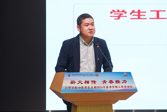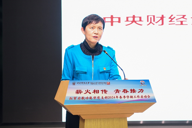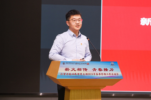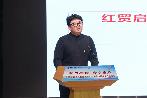 红贸启航功能型党支部先锋导师代表刘天宇从自身精彩纷呈的志愿服务实践出发,讲述青年一辈应有的使命担当。他从“肩负时代责任,创新创造奉献”“心怀远大理想,坚定信念奋发有为”“养成高尚品格,树立良好道德认知”三个层面,向同学们发出倡议,既要在专业学习这本“有字之书”里钻研,又要在实践学习这本“无字之书”中锤炼,收获真才实学和意志品格,不断成长成为对国家、对社会、对人民有益的人。他鼓励同学们在功能型党支部这一团结奋进大集体的引领下,共同努力、并肩前行,为公司的壮大繁荣、为国贸学子的成长成才奉献自己的智慧和力量。