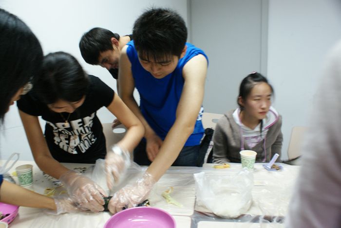 为了营造一个良好融洽的活动氛围,增进同学们之间的友谊,活动策划者别出心裁,活动设计的新颖别致,同学们也都饶有兴致的参与其中。互换月饼传祝福正式拉开本次活动的帷幕。班委给每位同学都发了月饼,并分发了祝福小纸条,同学们写下真挚的话语,通过互赠月饼,寄托真挚的祝福。接着,活动进入到制作寿司大比拼环节。每个小组同学亲自动手,用事先分发的食材制作寿司。同学们都积极出谋划策,职工同学也大显身手,积极参与其中。大家用友爱与欢乐共同烹饪一份独特可口的寿司。接下来,活动来到了更为激烈的欣赏视频短片抢答问题环节和电话连线活动。大家认真观看,积极思考,如侦探般运用自己的聪明才智让每一个问题都迎刃而解。电话连线环节,抽到三组同学,每组两位同学分别在教室内外,由教室内的同学给教室外的同学打电话,教室内的那位同学必须用聊天的方式让教室外的那位同学说出事先写在纸板上的一句话。看着教室内的同学绞尽脑汁、听着教室外的同学答非所问,同学们沉浸在欢声笑语之中。