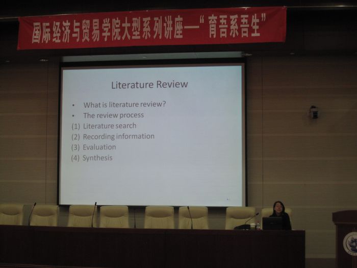 张老师在演讲中提到了研究生与博士生在做研究时的一些不足,并提出了自己的建议,首先,她建议在选择课题时必须选择自己感兴趣和爱好的领域并且投入足够的精力与时间,培养严谨的学术态度,严禁抄袭;其次,她就应该如何寻找问题、查询资料、搜集数据,运用何种软件进行估计等给出了自己的见解。
