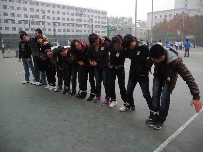 而“夕阳时分”的游戏则体现一个“慢”字,各组同学在跳着绳走完规定行程后,便排成一排,将自己与旁边队员的脚绑在一起,然后一组横着进行螃蟹走,先到目的地这获胜。这个游戏充分考验了全组同学的协作能力。