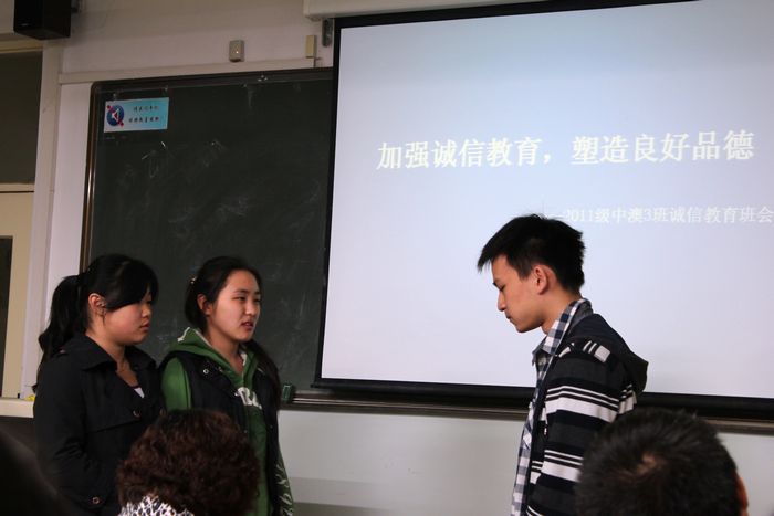 2012年4月19日,公司11级中澳4班举办了“加强诚信教育,塑造良好品德”主题班会。公司学工办主任卞松华老师应邀出席,辅导员杨宁老师,班级生活老师以及11级中澳3班全体同学参加了班会。