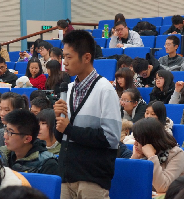 在交流会第二环节“我问你答,探讨交流”中,同学们积极思考,良好互动。一位同学对嘉宾王凤进提出“彷徨时如何调整心态”的问题,王凤进对此进行了详尽的回复,并鼓励大家自信乐观,倡导学雷锋,从小事做起。另一位同学则与葛丽对于个人道德修养与大学教育等问题进行了深入而热烈的讨论,使同学们得到更深刻的理解与体会。