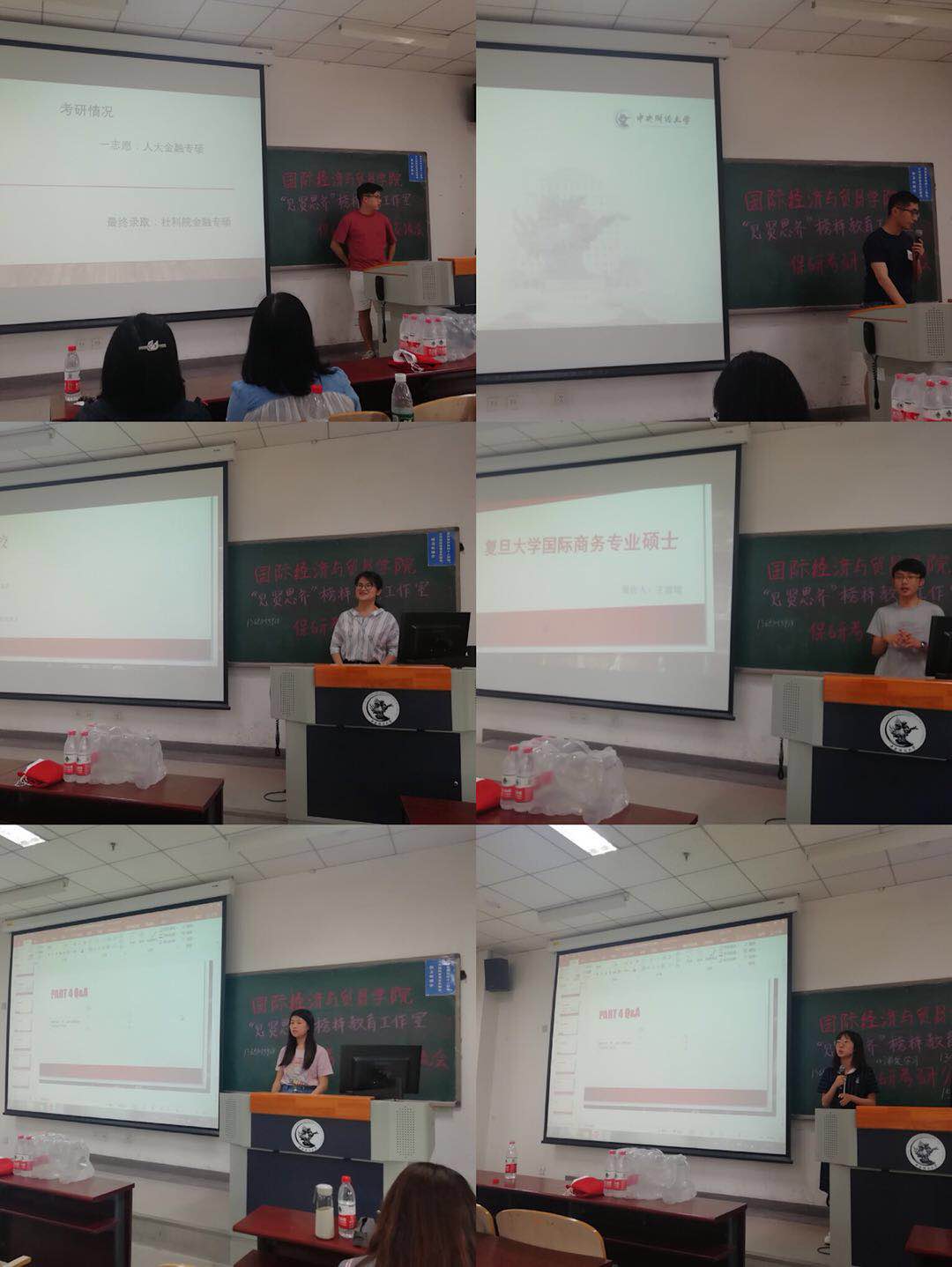 然后是考研成功的学长学姐们进行经验分享。孙子皓学长分享了考研初试失败后成功调剂至社科院金融专硕的经验。吴梓玠学长就考研的基本介绍、择校过程和准备过程三方面向同学们分享经验。尹彤学姐则着重分享了考研的择校及各科的复习经验。王嘉瑞学长因成功考入了复旦大学国际商务专业硕士,便着重讲解了复旦国商的考试科目、国际项目、参考用书以及复试等。宋琪学姐就考研方向的转变及考研用书和资料的推荐分享了自己的经验。刘一鸣学姐则将了很多考研中同学们可能注意不到但是很重要的一些小点。