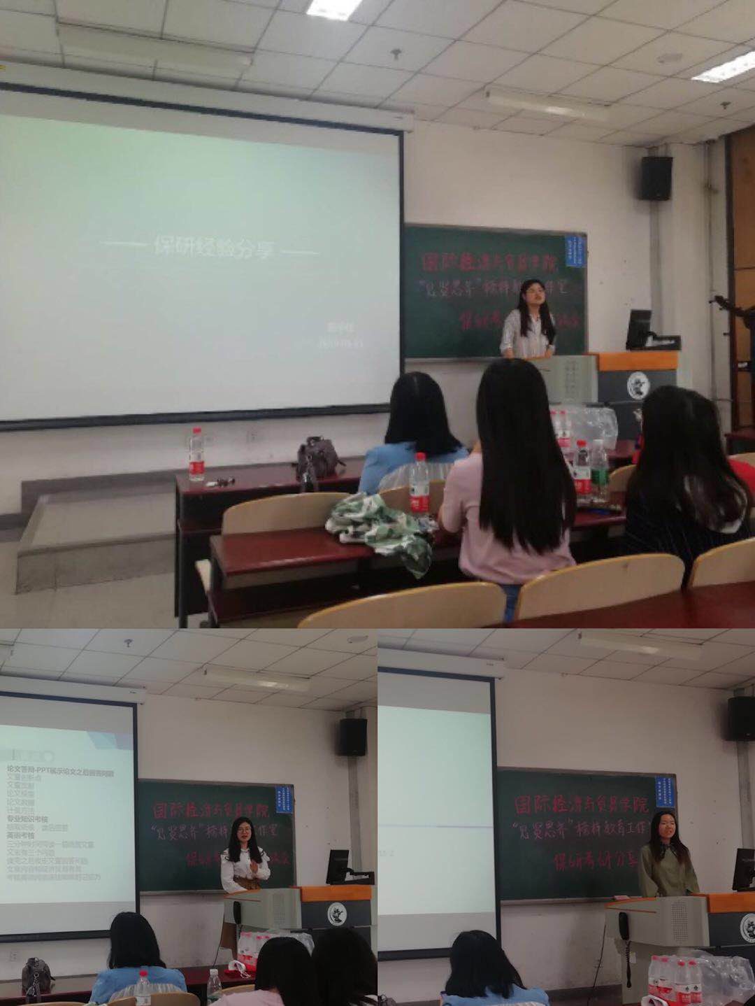 首先由学工办主任兼15级辅导员邱小花老师上台为同学们展示并分析了15级国贸公司各班学长学姐们的保研和考研的结果,可以看出国贸公司保研清北人大的人数不在少数,但各个班的考研成功率不容乐观。