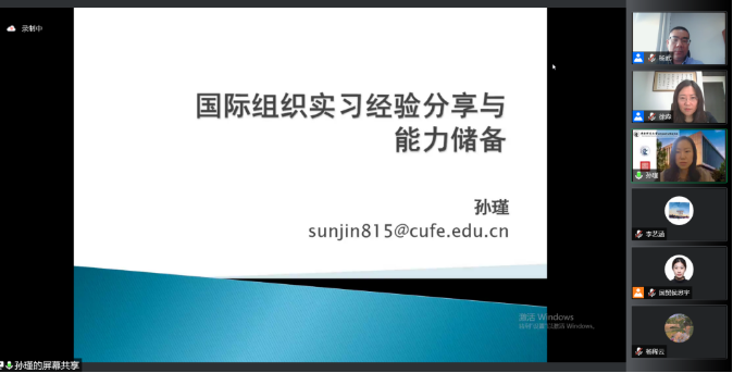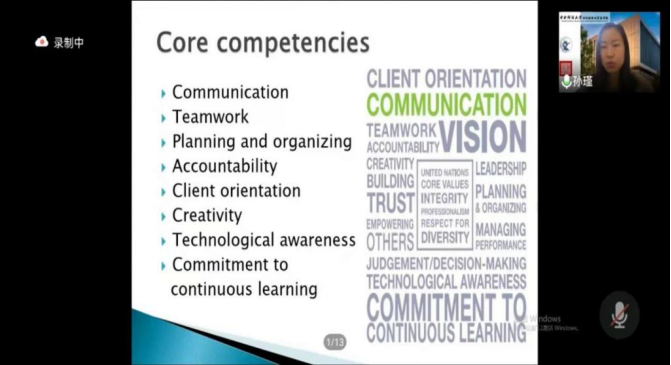 在国际组织实习的申请流程方面,孙老师总结出四项环节:递交申请材料、电话面试、笔试、面试。通过多年的实习工作,孙瑾也向大家分享了成功的经验: