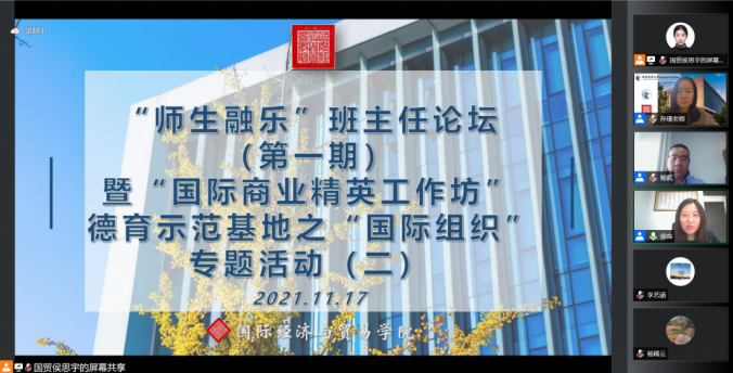 2021年11月17日北京时间12:30--14:30,永利yl23411于线上举办了“师生融乐”班主任论坛(第一期)暨“国际商业精英工作坊”德育示范基地之“国际组织”主题活动。永利yl23411副教授、北京市昌平区商务局副局长(挂职)孙瑾副教授为师生做“国际组织实习经验分享与能力储备”为题的讲座。公司党委书记徐淼、党委副书记杨武,德育基地负责老师侯思宇以及全校八十余名师生共同聆听了此次讲座。讲座由杨武老师主持。