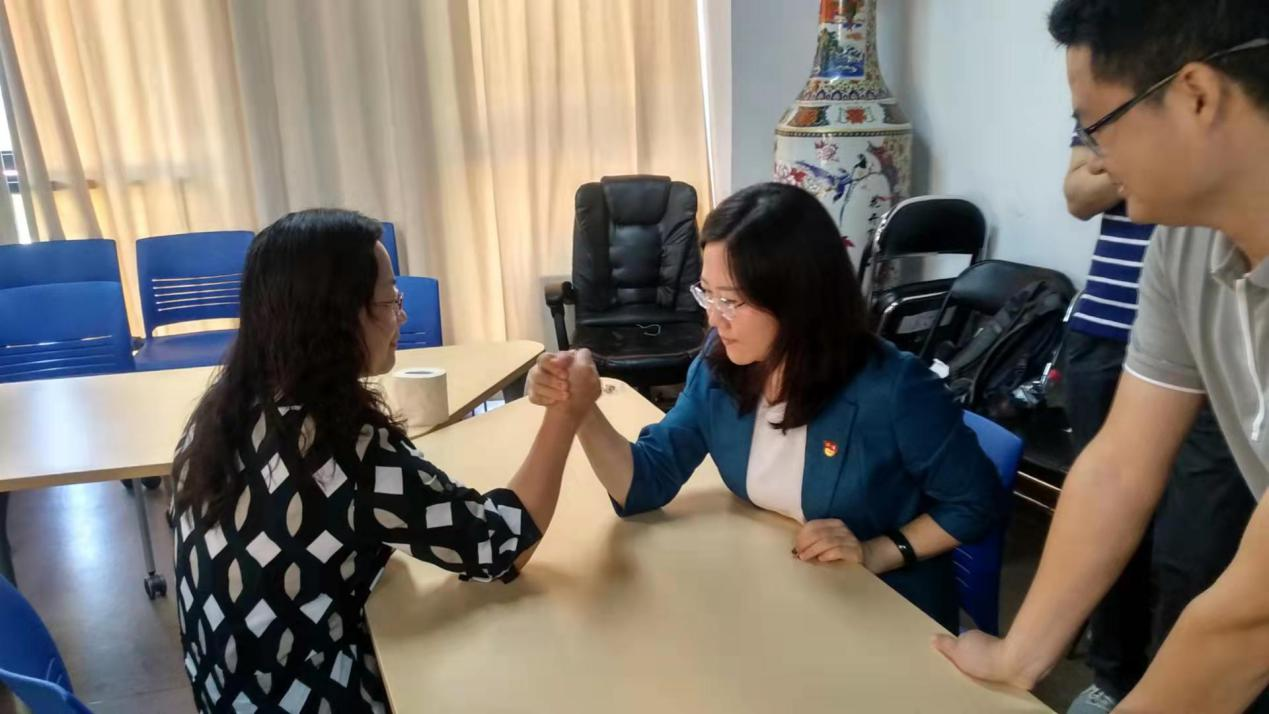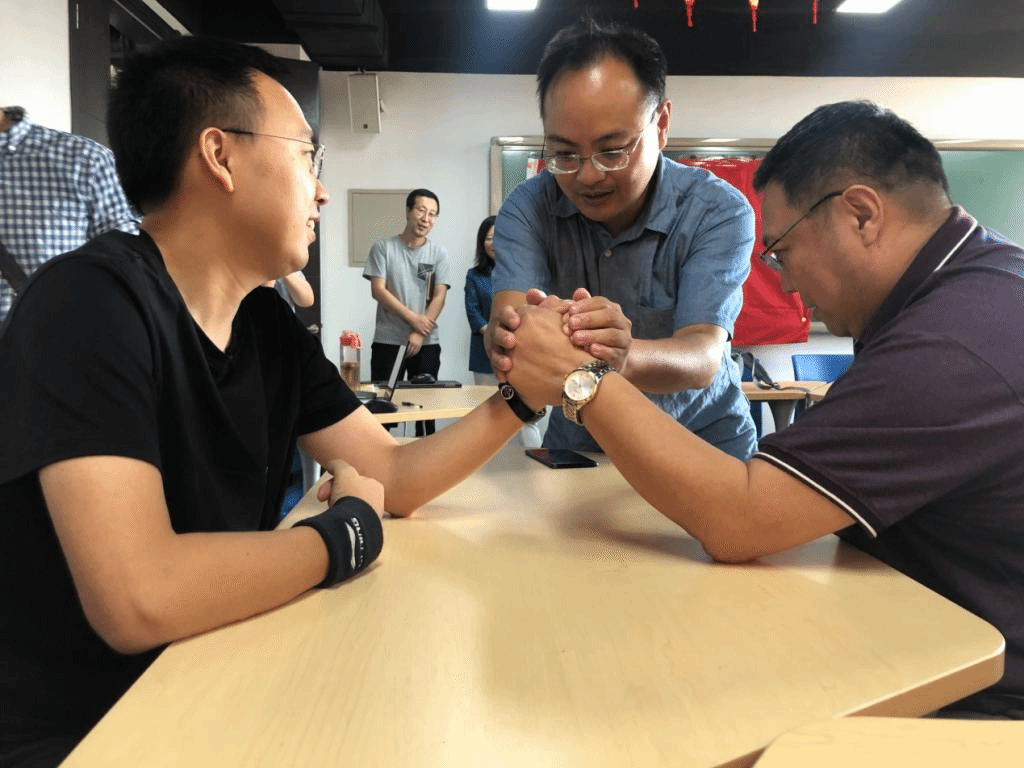 这次的比赛规则是,分男女教工组分别进行一对一的掰手腕比赛,在规定时间内手背被压倒至桌面者为失败。一局定胜负,允许败者要求三局两胜,以擂台赛的形式决出最后冠军。通知发出后,全院教职工踊跃报名,共有17位女教工、11位男教工报名参加比赛,包含了多位公司领导。比赛过程紧张激烈却又出人意料,扣人心弦,高潮迭起。除了几位公认的大力士之外,许多教学、科研、或者管理工作突出且看似文弱的老师们在比赛中展示出了未曾示人的惊人实力,引得围观的老师纷纷起立加油叫好。经过多轮激烈角逐,最终金旻老师力压群雄获得了男教工组冠军,举起了“大力神”水晶奖杯。而女教工组的争夺更为激烈,经过多轮耗时长久的鏖战,最终由徐淼、秦伊伦、陈名璐三位老师不分胜负,共同取得冠军,共享“女力神”奖杯。
