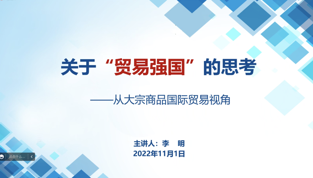 讲座伊始,李明副总颇有感悟地回忆起自己在中财国贸员工生活,他提到,正是由于在员工生涯中埋下了为中国贸易实业发展进步做贡献的种子,秉持着这颗初心,从毕业至今他一直从事贸易工作,而“贸易强国”也成为他多年来思考和实践的重要课题。随后,李明副总以十九大报告以及二十大报告作为引入,对“贸易强国”的深层含义进行了细致地阐述,提出了中国与其他贸易强国之间存在的差距,并以铜的国际贸易发展为例深入阐述对于“贸易强国”的思考。