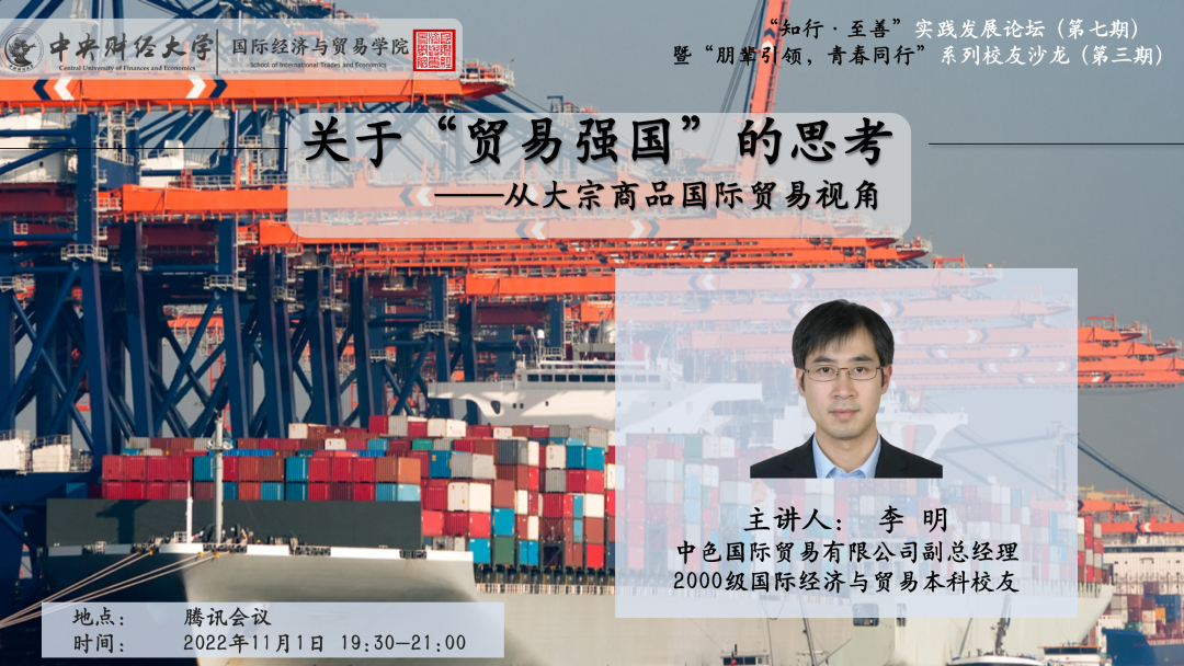 2022年11月1日19:30-21:00,永利yl23411案例教学与研究中心主办的“知行·至善”实践发展论坛(第九期)论坛于腾讯会议平台举行。本次论坛特邀中国有色矿业集团有限公司(简称中国有色集团)旗下全资子公司中色国际贸易有限公司(简称中色国贸)副总,公司国际经济与贸易专业2000级本科员工李明,论坛由永利yl23411案例教学与研究中心副主任孙瑾教授主持,公司老师、研究生和本科生共同参会。