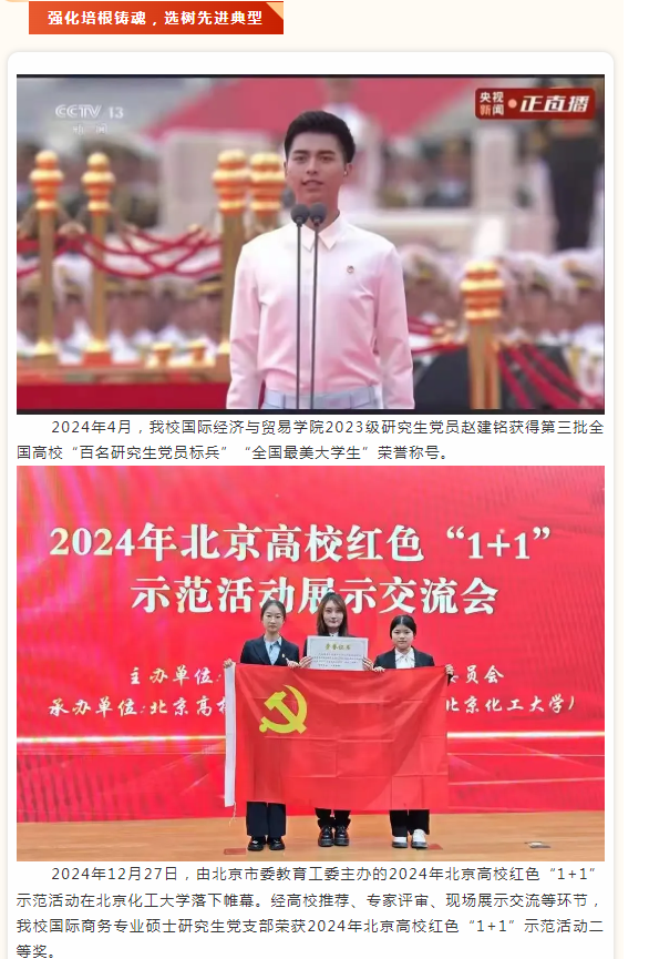 赵建铭同学和国际商务专业硕士研究生党支部在2024年研究生教育十大新闻的截图