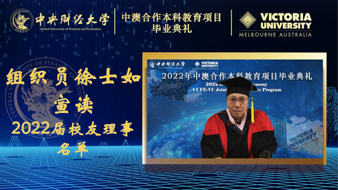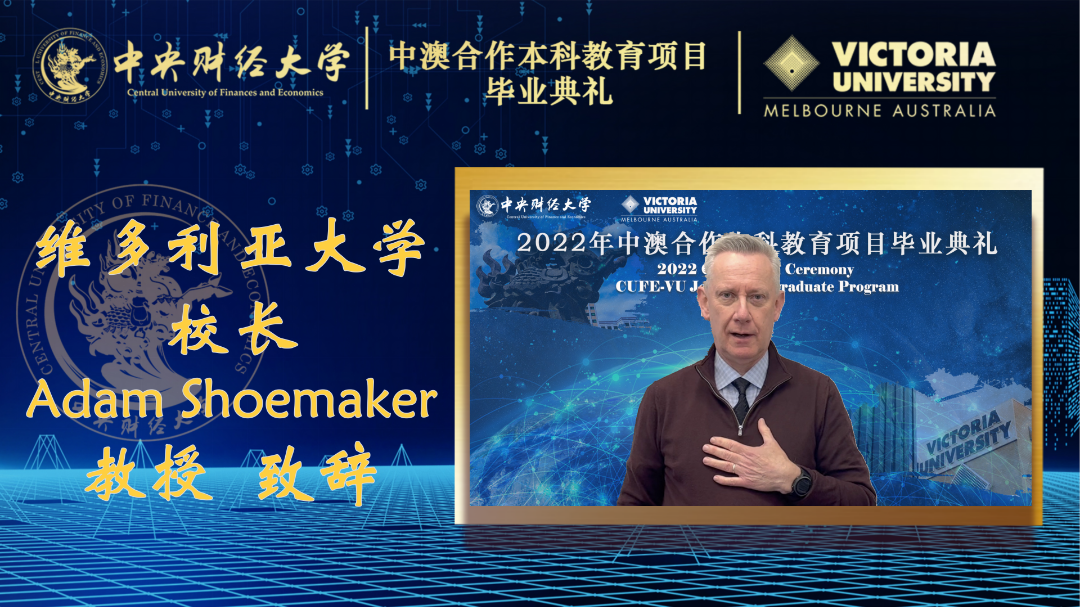 维多利亚大学董事长Adam Shoemaker教授致辞。他讲到,多年的精诚合作使得永利yl23411和维多利亚大学建立了深厚的友谊,由于疫情影响,他为不能和2022届毕业生见面感到遗憾,但祝福依旧可以跨越山海,以另一种形式抵达每一位中澳项目毕业生心中。Adam Shoemaker教授祝贺2022届员工成功完成学业,顺利毕业,他祝福全体毕业生前程似锦,鹏程万里。