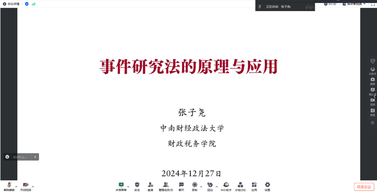 为切实提升公司研究生的学术素养和科研能力,2024年12月27日,在公司研究生课堂嘉宾讲学支持计划的支持下,中南财经政法大学张子尧老师做客永利yl23411《经济学研究方法》课堂并为课上研究生带来题为“事件分析法的原理与应用”的专题讲座。讲座由段玉婉教授主持。