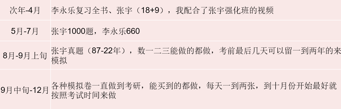 不管你考数一二还是三,这里的方法是通用的,我从数三换考数二,对数三也很了解。概率论也是按照表格里的李永乐、张宇足够了,最难的肯定还是高数。做了真题就会发现,数三也有好题,数一也没那么难。考数一数二的同学不要不屑于做数三真题。