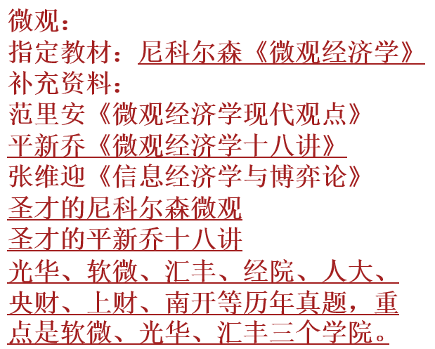 尼科尔森的书看过三遍,平新乔的书看过两遍,习题各做两遍之后再去做真题,软微光华汇丰经院,然后再去看书,课后习题,真题。