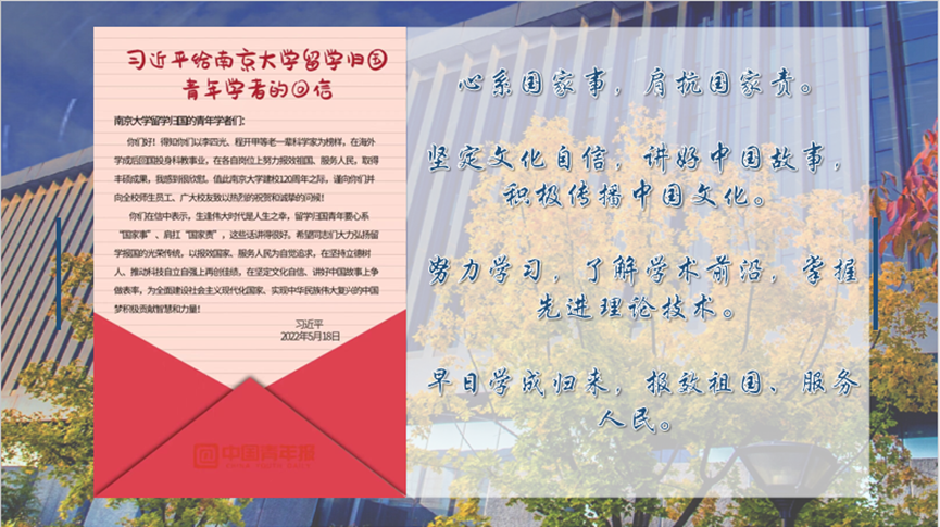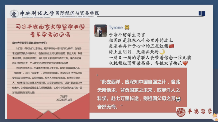 总书记的殷切嘱托是每个留学游子最重要的精神灯塔。因此,在讲座伊始,赵旭老师与参会员工共同学习了“习近平总书记写给南京大学留学归国青年学者的回信“。在信中,习近平总书记勉励同志们以报效国家、服务人民为自觉追求,在坚持立德树人、推动科技自立自强上再创佳绩,在坚定文化自信、讲好中国故事上争做表率,为全面建设社会主义现代化国家、实现中华民族伟大复兴的中国梦积极贡献智慧和力量!赵旭老师寄希国贸留学学子要心系国家事、肩扛国家责;坚定文化自信,讲好中国故事,积极传播中国文化;努力学习,了解学术前沿,掌握先进理论技术;盼早日学成归来,报效祖国、服务人民。