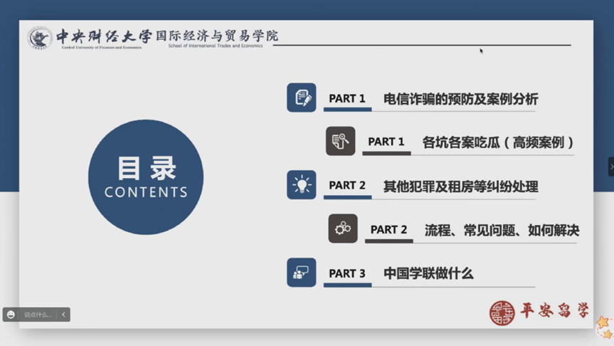 为帮助同学们顺利完成留学、平安归来报效祖国,本次讲座特别邀请到了教育部留学服务中心平安留学专家组成员、公司办公室赵虎老师,和大家分享平安留学的经验。赵虎老师从从电信诈骗的预防及案例分析、其他犯罪及租房等纠纷处理、中国学联的职责共三方面与同学们进行了深入的交流。