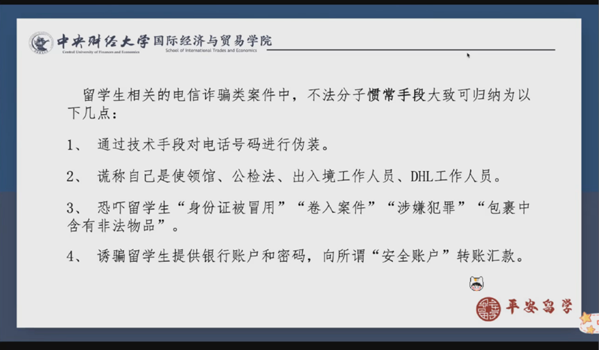 在第一部分中,赵老师从电信诈骗分类剖析与预防处理措施两方面向同学们讲述了出国留学中保护自己人身财产安全的宝贵经验。