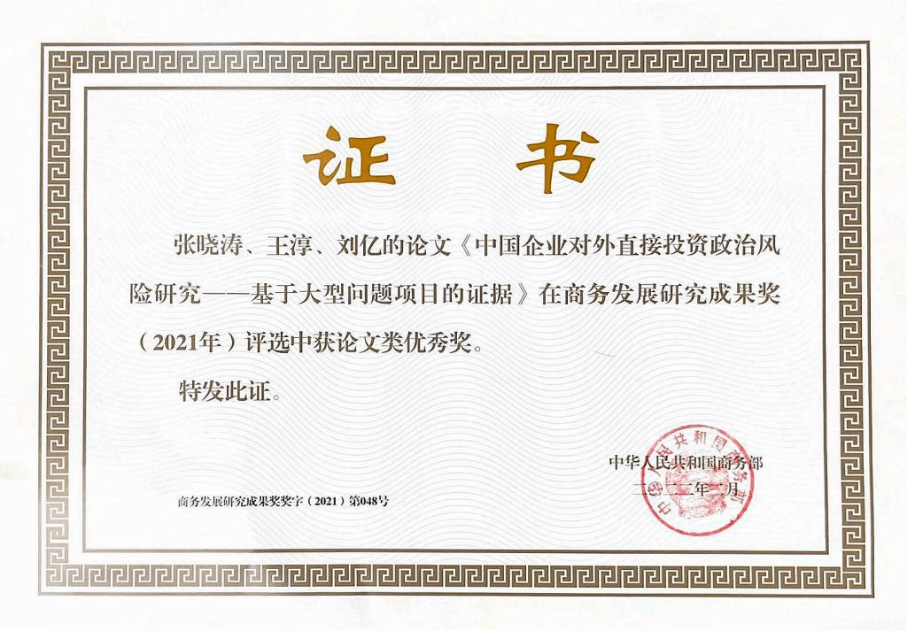 公司张晓涛教授(第一作者)及合作者的论文《中国企业对外直接投资政治风险研究—基于大型问题项目的证据》在2021年商务发展研究成果奖评选中获论文类优秀奖。该篇论文发表于《永利yl23411学报》2020年第1期,论文第二作者王淳为公司2017届国际商务硕士毕业生,论文第三作者刘亿为公司2020届国际贸易学博士毕业生。该篇论文是张晓涛教授团队在OFDI与中国企业国际化领域、“一带一路”经贸合作领域的系列研究成果之一。