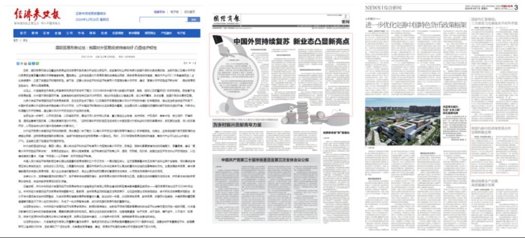 公司教师受邀在中非合作论坛、全球南方智库对话会、服贸会等经济主场外交活动做主题发言或参加圆桌讨论。2024年9月5日张晓涛教授团队发布《中国—非洲经贸投资合作发展报告(2024):共建“一带一路”十年》,得到主流媒体广泛报道。公司作为“一带一路”国际智库合作委员会、金砖国家智库合作中方理事会成员单位,2024年又成为“全球南方”智库合作联盟首批成员单位,受邀参加“全球南方”智库对话会。公司与大连瀚闻资讯有限公司联合建设的国际贸易形势论坛(ITSF)是新型高端智库,自创立以来月度论坛的重要观点均被《经济参考报》《国际商报》《中国财经报》等重要财经媒体报道,已成为研判中国外贸形势与热点问题分析的知名平台。