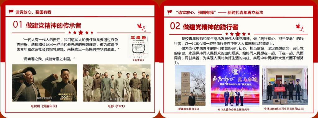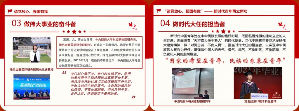 通过这次授课,同学们进一步深入了解党的初心宗旨、光辉历程和巨大贡献,也了解了中财大为国而生的光荣历史,同时也告诉同学们,新时代青年要勇担重任,沿着中财的历史传承,接下接力棒,继续与国同行,为祖国的各项事业发展贡献一份中财人的力量,让“中财红”在祖国大地绽放。同学们也必然会在伟大建党精神的感召下,听党话、跟党走,做新时代财经报国的“排头兵”!不负“请党放心、强国有我”的誓言!