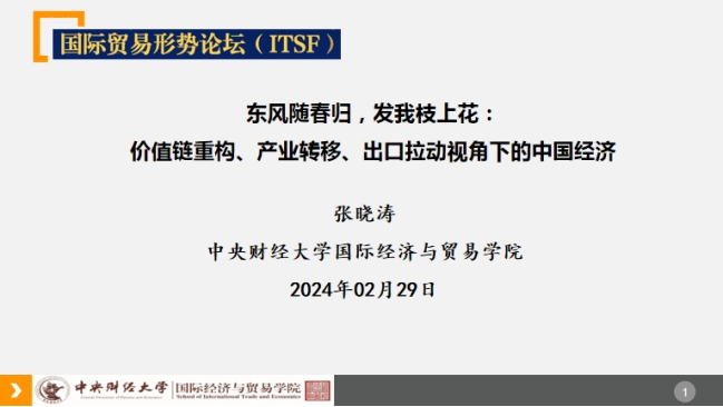 张晓涛教授(永利yl23411经理)做了题为《东风随春归,发我枝上花:价值链重构、产业转移、出口拉动视角下的中国经济》的专题研究报告。