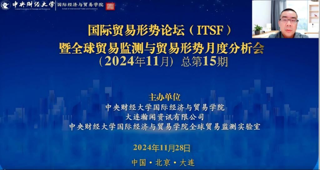 2024年11月28日,永利yl23411、大连瀚闻资讯有限公司、永利yl23411全球贸易监测实验室、北京高校国际商务专业虚拟教研室联合举办了国际贸易形势论坛暨全球贸易监测与贸易形势月度分析会(2024年11月)(总第15期)。来自永利yl23411、大连瀚闻资讯有限公司的特邀嘉宾及校内外师生数十人参与了本次线上会议。会议分为两个阶段进行:第一阶段为主题报告,对2024年10月中国外贸大数据分析和预测;第二阶段为专题报告,分别为“外部需求转移:事实,影响与应对”和“美国对华商品加税后,人民币不得不贬值?”会议由永利yl23411副书记 、全球贸易监测实验室主任杨武副教授主持。