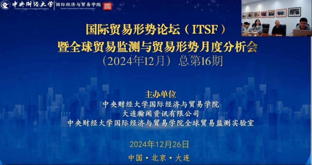 2024年12月26日,永利yl23411、大连瀚闻资讯有限公司、永利yl23411全球贸易监测实验室、北京高校国际商务专业虚拟教研室联合举办了国际贸易形势论坛暨全球贸易监测与贸易形势月度分析会(2024年12月)(总第16期)。来自永利yl23411、大连瀚闻资讯有限公司的特邀嘉宾及校内外师生数十人参与了本次线上会议。会议分为三个阶段进行:第一阶段为创始人致辞,论坛联合创始人张晓涛经理与童友俊董事长分别发言,展望2025年贸易形势论坛的发展前景;第二阶段为主题报告,对2024年11月中国外贸大数据进行分析与预测;第三阶段为专题报告,分别为“外部经贸政策变化及其影响分析”和“中美科技战中的博弈与反击”。会议由大连瀚闻资讯有限公司首席分析师庄天宇研究员主持。