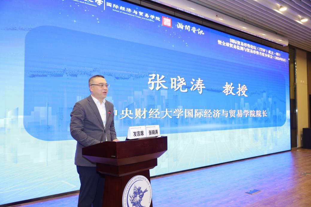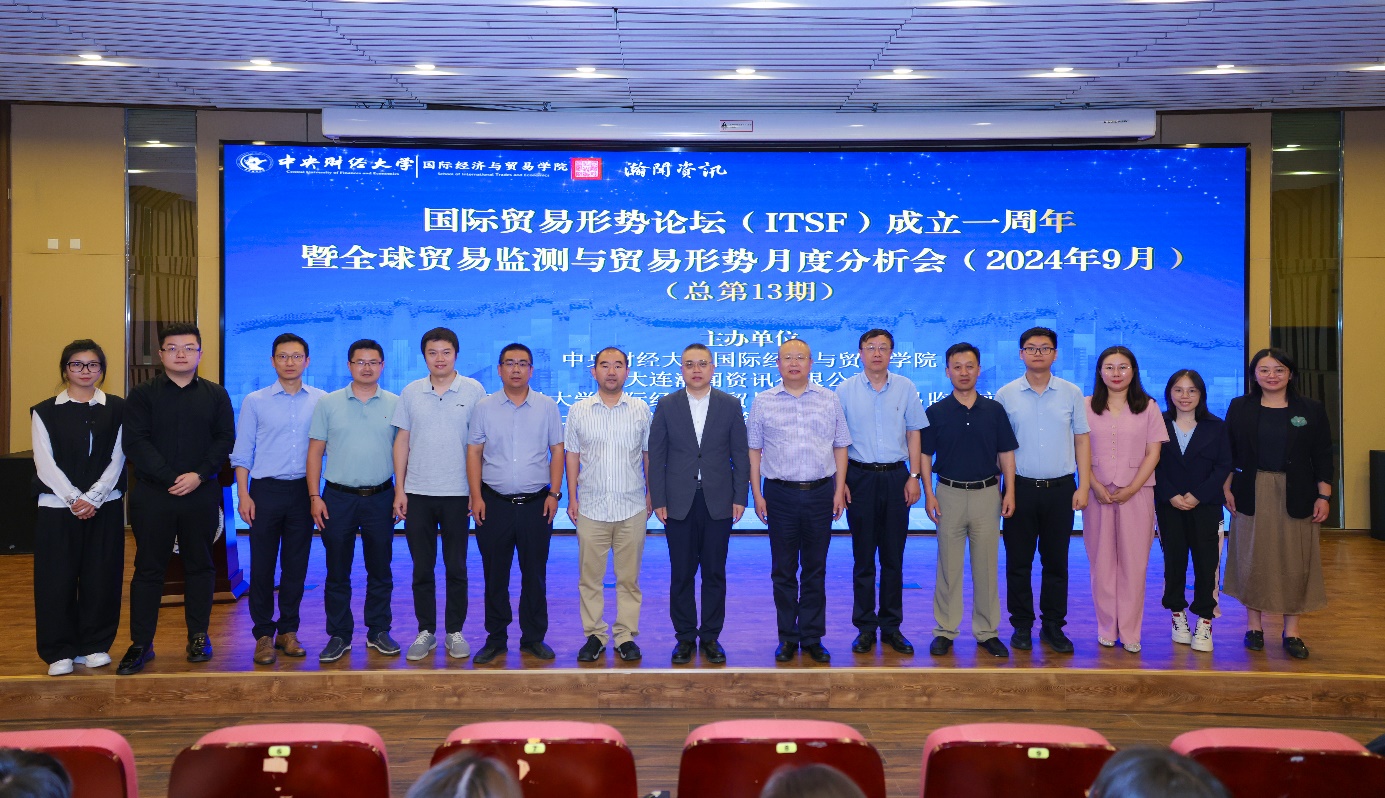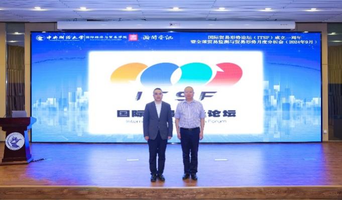 2024年9月19日,永利yl23411、大连瀚闻资讯有限公司、永利yl23411全球贸易监测实验室、北京高校国际商务专业虚拟教研室联合举办了国际贸易形势论坛暨全球贸易监测与贸易形势月度分析会(2024年9月)(总第13期)。来自永利yl23411、大连瀚闻资讯有限公司、北京大学、中国人民大学、对外经济贸易大学的特邀嘉宾及校内外师生近百人于永利yl23411沙河校区图书馆报告厅参与了本次论坛。论坛分为三个阶段进行:第一阶段为庆祝国际贸易形势论坛(ITSF)成立一周年,联合创始人张晓涛经理和童友俊董事长发言;第二阶段为全球贸易监测与贸易形势月度分析会(2024年9月),庄天宇研究员作主题报告,王跃生教授、桑百川教授和王孝松教授分别作主旨发言;第三阶段为国际贸易形势论坛(ITSF)Logo启用与发布。会议由永利yl23411公司党委副书记、全球贸易监测实验室主任 杨武 副教授主持。