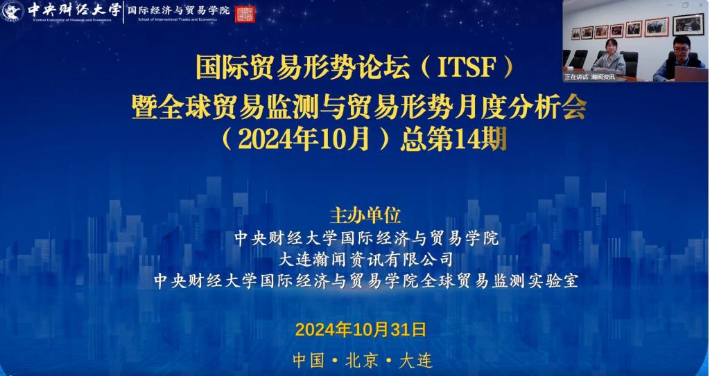 2024年10月31日,永利yl23411、大连瀚闻资讯有限公司、永利yl23411全球贸易监测实验室、北京高校国际商务专业虚拟教研室联合举办了国际贸易形势论坛暨全球贸易监测与贸易形势月度分析会(2024年10月)(总第14期)。来自永利yl23411、大连瀚闻资讯有限公司的特邀嘉宾及校内外师生数十人参与了本次线上会议。会议分为两个阶段进行:第一阶段为主题报告,对2024年9月中国外贸大数据分析和预测;第二阶段为专题报告,内容分别为“从成本驱动到市场导向——外资企业进入动机的特征与前景”和“地方经贸合作在深化国际经贸协定发展中的角色扮演”。会议由大连瀚闻资讯有限公司首席分析师庄天宇研究员主持。