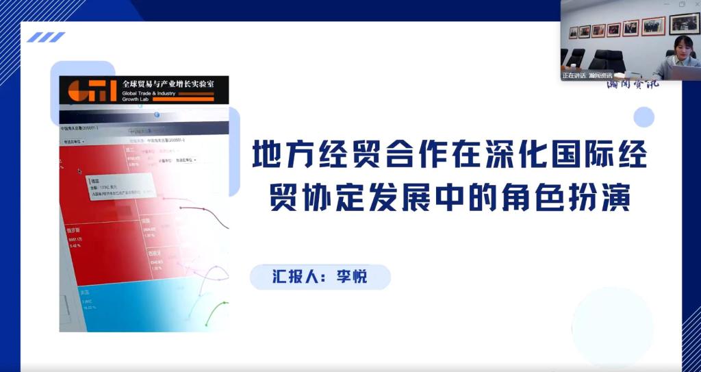 李 悦(大连瀚闻资讯有限公司分析师)做了题为《地方经贸合作在深化国际经贸协定发展中的角色扮演》的专题报告: